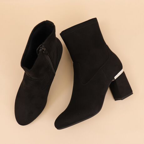 ・ヒール根元のビジューが目をひくショートブーツ。シンプルなデザインながらも、歩く度にビジューがきらめいて華やかさを添えてくれます。