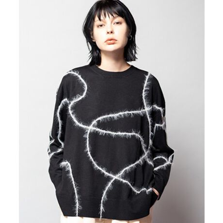 ルーズなシルエットのプルオーバーに、シャギー糸で描線のアクセント。