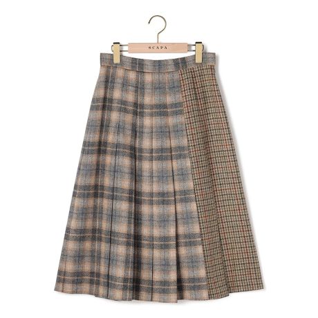 パターンの異なるチェックを掛け合わせた、切り替えデザインのプリーツスカート。膝が隠れるミディアム丈は、大人のトラッドスタイルを演出します。ローファーやブーツ、カラータイツにソックスと、足もとのお洒落でスタイリングの変化を楽しめるのが魅力。トップスは、すっきりと裾をインするのがおすすめです。