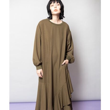 [型番:700006-376O]グッドガールなストライプワンピースは、フリルの甘さをモードな切替が程よくビターに仕上げ、1枚でドラマを感じさせる。===========================透け感: なし伸縮性: ややあり光沢感: 僅かにあり裏地: なし素材について: インナーが響かない厚み、ストレッチの効いた落ち感のある素材===========================