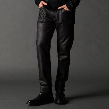 ポリエステルのマイクロファイバーで編まれたポンチ素材の表面をスウェード起毛、滑らかなタッチとソフト風合いを特徴にしたカットソー素材です。トーン違いの同色系ムラプリントを施して革パンの様なレザーライクな見え方に作っています。マルチなストレッチ性、ジャージ素材なのではのプリッとした横張り感もあり、シルエットを綺麗に作ります。更に生地加工で撥水効果をプラス、防汚効果を高めています。今季新色の60ピーコックブルーを展開します。