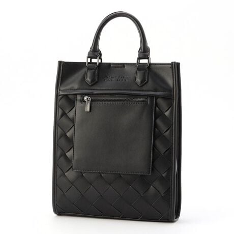 手持ち用のハンドルに加え付属のショルダーベルトを取り付けて肩掛けも可能なスクエア型2WAYバッグ。今季はハンドル付けに金具を使用して使用感を向上させました。前後の編み込みデザインを最大のポイントとして、側面は編み込みなしのフラットな仕様で見た目にメリハリをプラス。フロント面には吊り下げタイプのファスナーポケットをあしらいアクセントにしています。モードスタイリングにもピッタリなトレンド感満載のバッグです。
