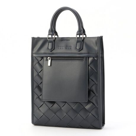 手持ち用のハンドルに加え付属のショルダーベルトを取り付けて肩掛けも可能なスクエア型2WAYバッグ。今季はハンドル付けに金具を使用して使用感を向上させました。前後の編み込みデザインを最大のポイントとして、側面は編み込みなしのフラットな仕様で見た目にメリハリをプラス。フロント面には吊り下げタイプのファスナーポケットをあしらいアクセントにしています。モードスタイリングにもピッタリなトレンド感満載のバッグです。