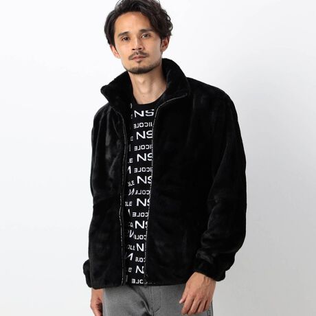 スタンドカラーのファーブルゾン。袖のバランスとウエスト〜裾廻りを少しシェイプさせ、野暮ったいシルエットにならない様に調整しています。切り替えを利用した配色デザインと、その切り替えを利用してシルエットを作っています。後身から右袖にまたがせたパッチワークロゴ刺繍をアクセントにしています。裾裏にはしっかりとした不織布タイプの芯地を貼った別生地仕様、袖口には平ゴムを仕込み防風性を高めています。厚手のポリエステル別布を使用して厚み解消やファスナー噛みの防止の持ち出しを作っています。