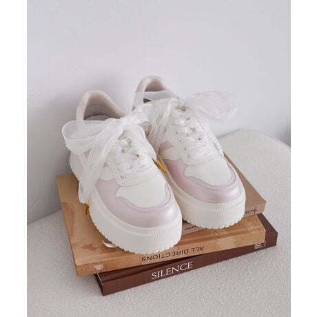 パールのような光沢感のあるコンビデザインがポイントの厚底スニーカー。