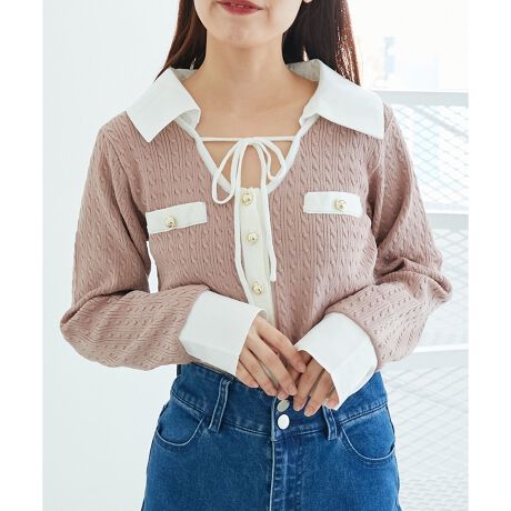 パッと目を引くバイカラーデザインと、クラシカルな布帛の襟が大人上品な一枚。