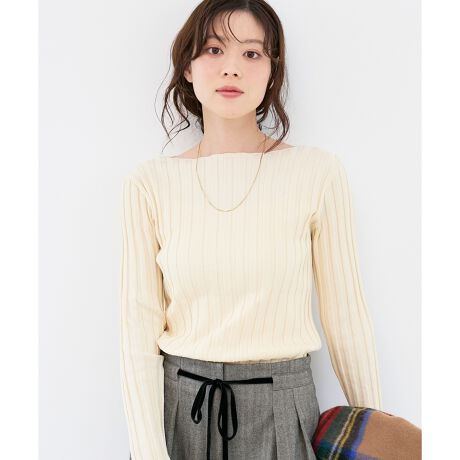 リブ編みとクラシカルなネックラインが、顔周りをすっきりと見せてくれます。