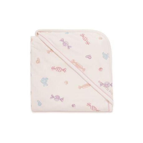 gelato piqueらしいベアやロゴモチーフのカラフルなキャンディを散りばめた、HAPPYな総柄プリントのBABYブランケットです。柔らかく適度な厚みのあるコットン混のインレイ素材を使用。フード付きなので室内でのお昼寝にはもちろん、お出かけにもご使用いただけます。フード部分にワンポイントで刺繍を入れ、縁に配色のパイピングを付けました。同シリーズのルームウェアや小物と組み合わせて、ギフトにもおすすめのアイテムです。
