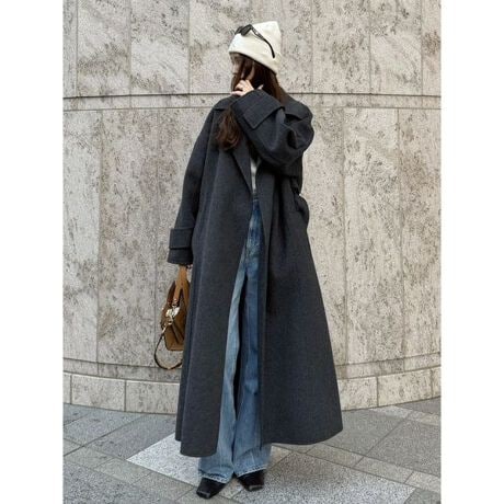 大きめの襟が目を引くバルマカンコートは、シンプルでありながらもセンスが光る一枚。