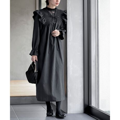 肩のフリルと胸元のシャーリングが大人ガーリーな装いを演出するワンピース