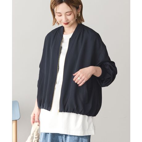 適度なハリ感とドレープ性のある軽やかな着心地が魅力のブルゾン。マニッシュなイメージながら、裾シャーリングを施した丸みのあるシルエットが甘さをプラスするトレンドライクな1着です。裏地付きで寒い日のアウターとしても活躍し、スイッチシーズンにもぴったり。Iラインスカートやスラックスと相性の良い絶妙な丈感なのもポイントです。透け感[なし]