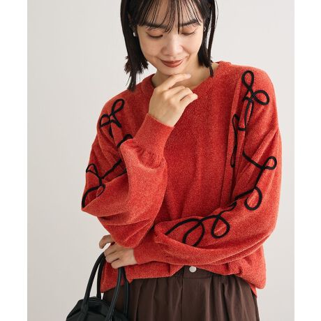 ほんのりラメを効かせたふっくら毛足のニットプルオーバー。ドロップしたショルダーラインにゆとりあるフォルムでラフに着用いただける1枚です。ワントーンカラーに映える刺繍コードのニュアンスあるラインがこだわりのポイント。カジュアルなデニムスタイルからフェミニンなボリュームスカートまで幅広く合わせていただけるおすすめのアイテムです。透け感[なし]