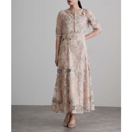 立体感のある刺繍ワンピースにチュールを重ねた、目を惹く華やかさ。
