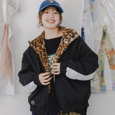 シャカシャカとしたナイロン素材と、レオパード柄フェイクファーを組み合わせた