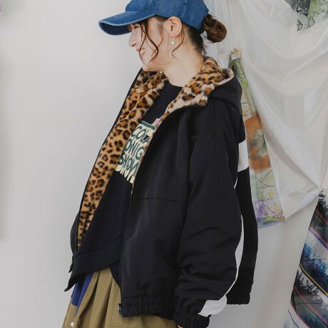 シャカシャカとしたナイロン素材と、レオパード柄フェイクファーを組み合わせた