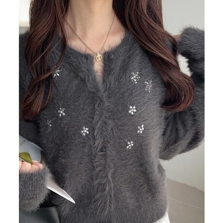 冬らしいシャギー素材とビジューが目を惹くカーディガン。