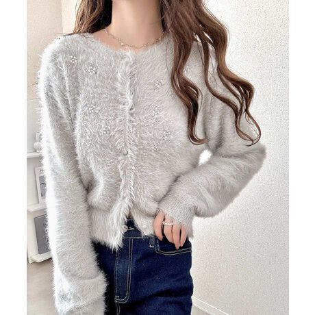 冬らしいシャギー素材とビジューが目を惹くカーディガン。