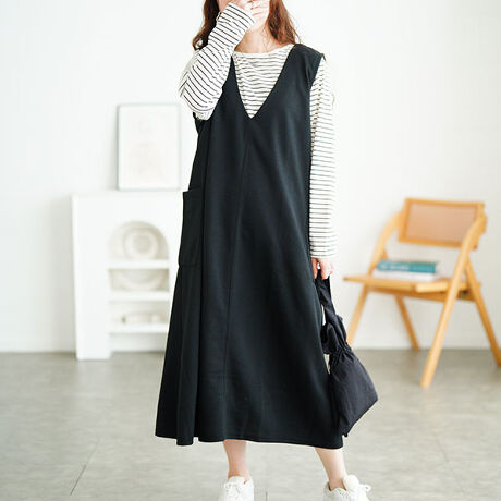 セットで着れば、統一感のある旬なレイヤードスタイルが即完成。忙しい朝にもコーデに迷うことがありません。もちろん、それぞれ単品でも着回し力は抜群。大人の余裕感じるカジュアルスタイルが決まるアンサンブルアイテムです。ベーシックなボーダーTシャツがカジュアル感を加速させ、黒のシンプルなジャンパースカートで大人っぽさを演出。深めのVネックラインと、ストンと落ちる美しいAラインシルエットが魅力。体のラインを拾いにくく、リラックスしながらも上品なスタイルに。