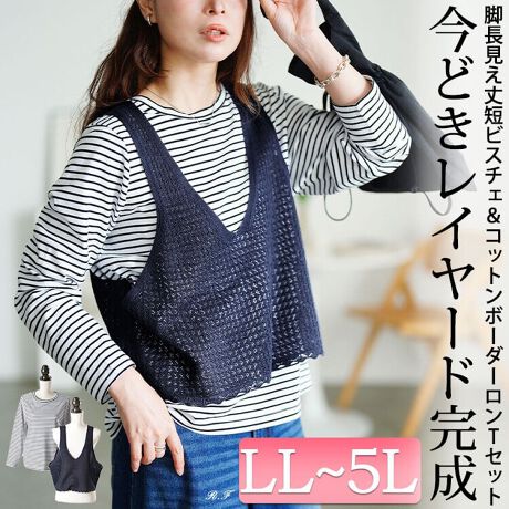 このセットで人気のビスチェコーデをGET!レース編みビスチェ&コットンボーダーロンT2点セットの登場です☆今旬のレース編みビスチェにコットンボーダーロンTをON!敬遠しがちなボーダーもレイヤードなら体を大きく見せないので安心してボーダーコーデを楽しんでいただけます◎それぞれ単品使いも可能なのでお手持ちのアイテムと合わせてお楽しみください♪ボディラインを拾わないこなれ感漂うラフなレイヤードで体型カバーも抜群です◎