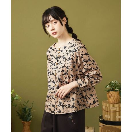 ホコモモラらしい楽しい柄のブラウス。マドリードにある大きな公園をイメージし、木にとまる鳥やフクロウ、リスなどをイメージしたユニークなプリント柄でお仕立てしました。ヨーク切り替え入りのラグランスリーブで快適な着心地を実現。ゆったりとしたシルエットで身体のラインを拾いにくく体型カバーを叶えます。羽織としても着られる前開き仕様です。ホコモモラらしい配色ボタンにも注目。