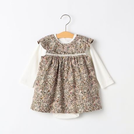 可愛らしい小さな動物や木の実がプリントされたコーデュロイ素材のジャンパースカートと適度なフィット感のロンパース。
