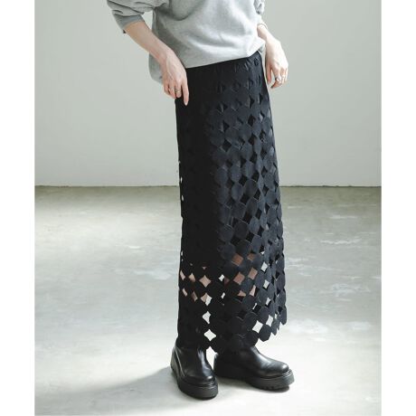 伸縮性のあるニット素材を用い、円形のモチーフを連ねることで丸くない部分に透け感が出るドラマティックな雰囲気のタイトスカート。