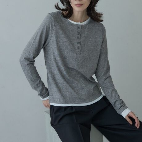 袖口と裾のレイヤー配色がさりげない遊び心を演出し、シンプルな中にも個性が光ります。