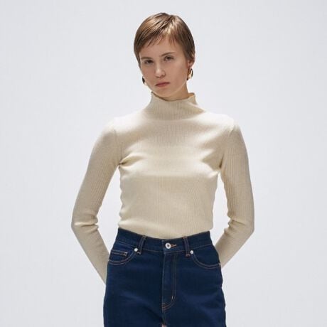 ・高すぎないハイネックデザインで首元をすっきりとカバーしつつ、上品な抜け感を演出。
