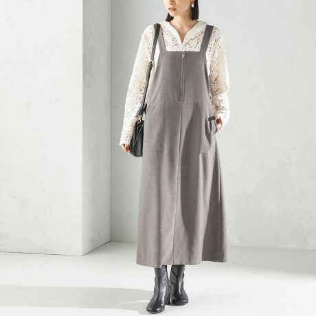 フロントジップでカジュアルな印象を残しながらすっきりとしたAラインシルエットのジャンパースカート。