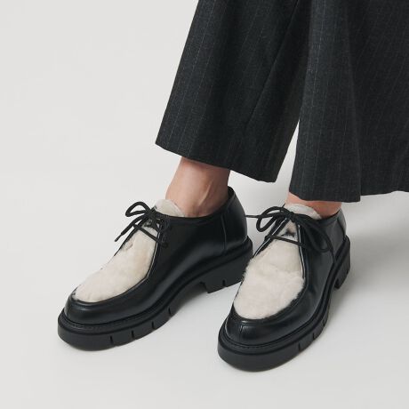 甲部分にフェイクファーをあしらった、マニッシュな印象のレースアップシューズ。