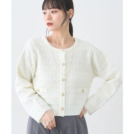 リボンヤーンなどのミックスツイード生地が上品な雰囲気のニットジャケット。ところどころに入ったラメ糸とゴールドカラーの大きめボタンが華やかなアクセントになっています。カーディガン感覚で羽織れる絶妙なシルエットデザインも魅力的。クラシカルな印象を活かしたきれいめなスタイリングはもちろん、デニムなどカジュアルなアイテムと合わせて着崩すのもおすすめです。透け感[なし]