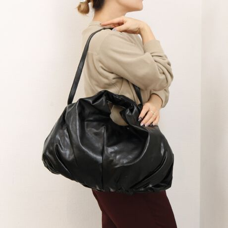 底部分に大きくキャザーを入れてバルーンのように膨らんだフォルムがポイントの手提げバッグ。