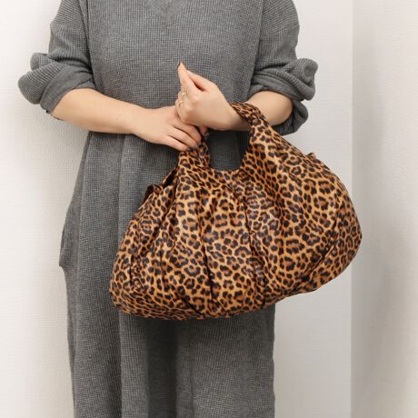 底部分に大きくキャザーを入れてバルーンのように膨らんだフォルムがポイントの手提げバッグ。