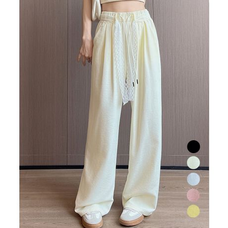 フェミニンなレースベルトがアクセントになったワイドパンツ。
