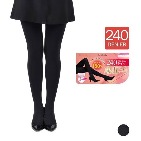 裏地を起毛させているので、ふんわりあったか。やわらかく優しい肌触りのタイツです。ヒップには後長マチが付いているので、お尻周りはゆったり履き心地抜群。240デニール相当の厚みがあるので、寒い冬の味方です。つま先スルーなので、靴を脱いだ時に綺麗な印象を与えてくれるのも嬉しいポイントです。