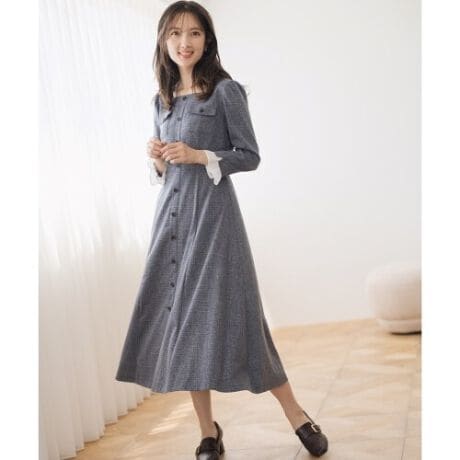 2025秋冬新作 フロント釦ツイード風フレアワンピース