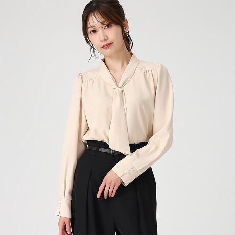 【秋らしさと上品さを纏う、定番シャーリング袖ボウタイブラウス】