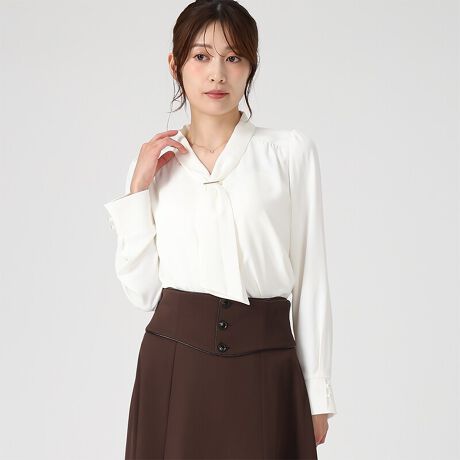 【秋らしさと上品さを纏う、定番シャーリング袖ボウタイブラウス】