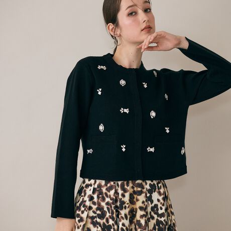 ・シンプルな本体にビジューが映えるニットカーディガン。