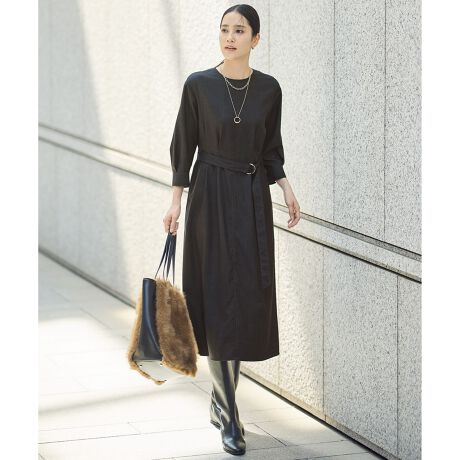 すっきり見えが叶うシルエットのデニム調ワンピース■デザインしなやかなタッチのウール混デニム調素材でお作りしたノーカラーのワンピースです。フォルムを出したお袖でカジュアルになり過ぎない大人っぽい印象の1着です。ウエストにダーツとタックを入れることで、ゆとりがありながらもすっきりと見えるシルエットになっています。共のベルトでウエストマークしての着用もおすすめです。※画像はサンプルを使用しております。ブラウン(035)は実際にお届けする商品はステッチの色が生地と同色になります。ダークインディゴ(075)は実際にお届けする商品はウエスト部分のステッチの色が生地と同色になります。■素材スパンポリエステルと細番手メリノウールの混紡糸を使用した、ウール混できれいめなデニムライク素材です。裏糸に白い糸を使用し、表からその糸が少し見えるようにすることで、デニム調のシャンブレー感を表現しています。ウォッシャブルで洗ってもシワになりづらく、ストレッチ性もある素材です。■同素材アイテムジャケット(JKWRGW0407)カーブテーパードパンツ(PRWRGW0408)ワイドパンツ(PRWRGW0407)