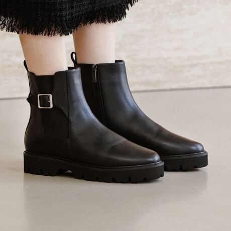程よい厚みのあるトラックソールのサイドゴアブーツは毎年人気のアイテム。今季はバックル付きのサイドベルトデザインでさりげないアクセントに。 中敷きにはかかと部分のフィット感アップと衝撃吸収効果を兼ね備えたハーフタイプのインソールを搭載。ソフトな撥水レザーを使用しているので足当たりも柔らかく、軽量ソールで楽に履けるのがポイントです。 足首をすっきり見せるフィット感のあるシルエットにこだわり、トレンド感がありながらも履き心地も安心な一足です。