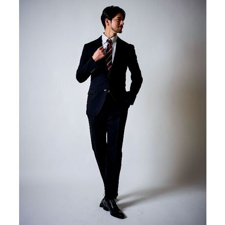 肩から胸元にかけてスマートなサイジングを採用し、ビジネスからフォーマルシーンまで対応する万能な一着です。