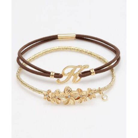 [型番:4CSZ5301-2025]静電気除去効果のあるヘアゴムブレスレット。手首や髪につけると溜まった電気を放出します。ハワイアンジュエリー調のプルメリアと、イニシャルのチャーム付き。静電気除去効果
