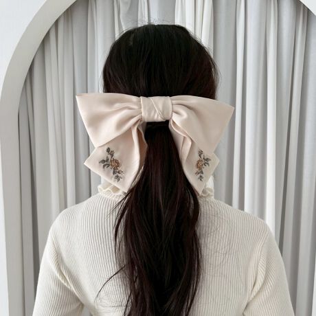 ローズの繊細な刺繍が目を惹くビッグリボンバレッタ。