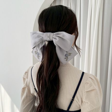 ローズの繊細な刺繍が目を惹くビッグリボンバレッタ。