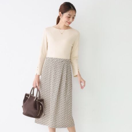 ニットとプリントスカートのドッキングワンピース。
