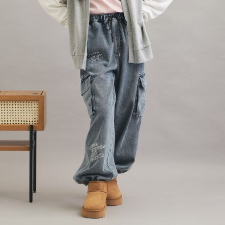 刺繍とプリントでラクガキ風のグラフィックが目を惹くデザインで、ウエストスピンドル仕様なのでサイズ調整可能◎