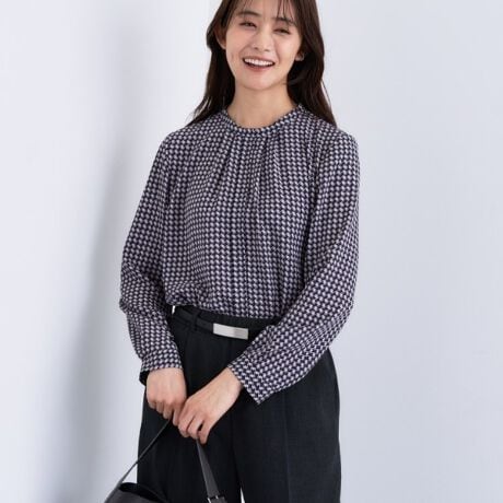 やや詰まったスタンド衿にタックデザインが秋冬感も感じるブラウスです。