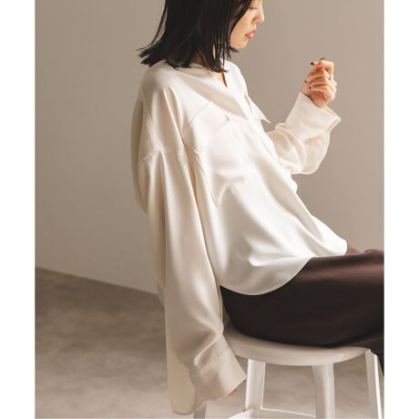光沢のある素材や潔く開いたVネックなどの女性らしいデザインの中に、胸元には大きめのポケットを取り入れたりと、程よく大人っぽさを加えスパイスをプラス。