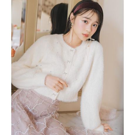 纏うだけで華やぐ、パール&ビジューの主役級カーディガン【Design】・フロントに散りばめたパール&ビジューが、動くたびに上品な輝きを放ちます♪・フロントのリボンボタンが甘さを添えてくれます。・エアリーでふわっとしたフェザーニットは、見た目も着心地もあたたかく柔らかいです。・絶妙な丈感がボトムスを選ばず、バランスの良いスタイリングが叶います。・前を閉じてプルオーバー風に着たり、着回し力も抜群◎・秋冬のコーデを一気に華やかに格上げしてくれる、ワードローブの頼れる一着です♪【Fabric】・なめらかな肌触りで着心地が良く、女性らしいシルエットを美しく引き立ててくれます。・ご自宅でお手入れが出来るのも嬉しいポイント♪・ホワイト、ピンク、モカ、ブラウン(ルミネスト新宿店、ルミネ有楽町店、梅田EST店、WEB限定カラー)、ブラックの5色展開となります。【Care】手洗い可能